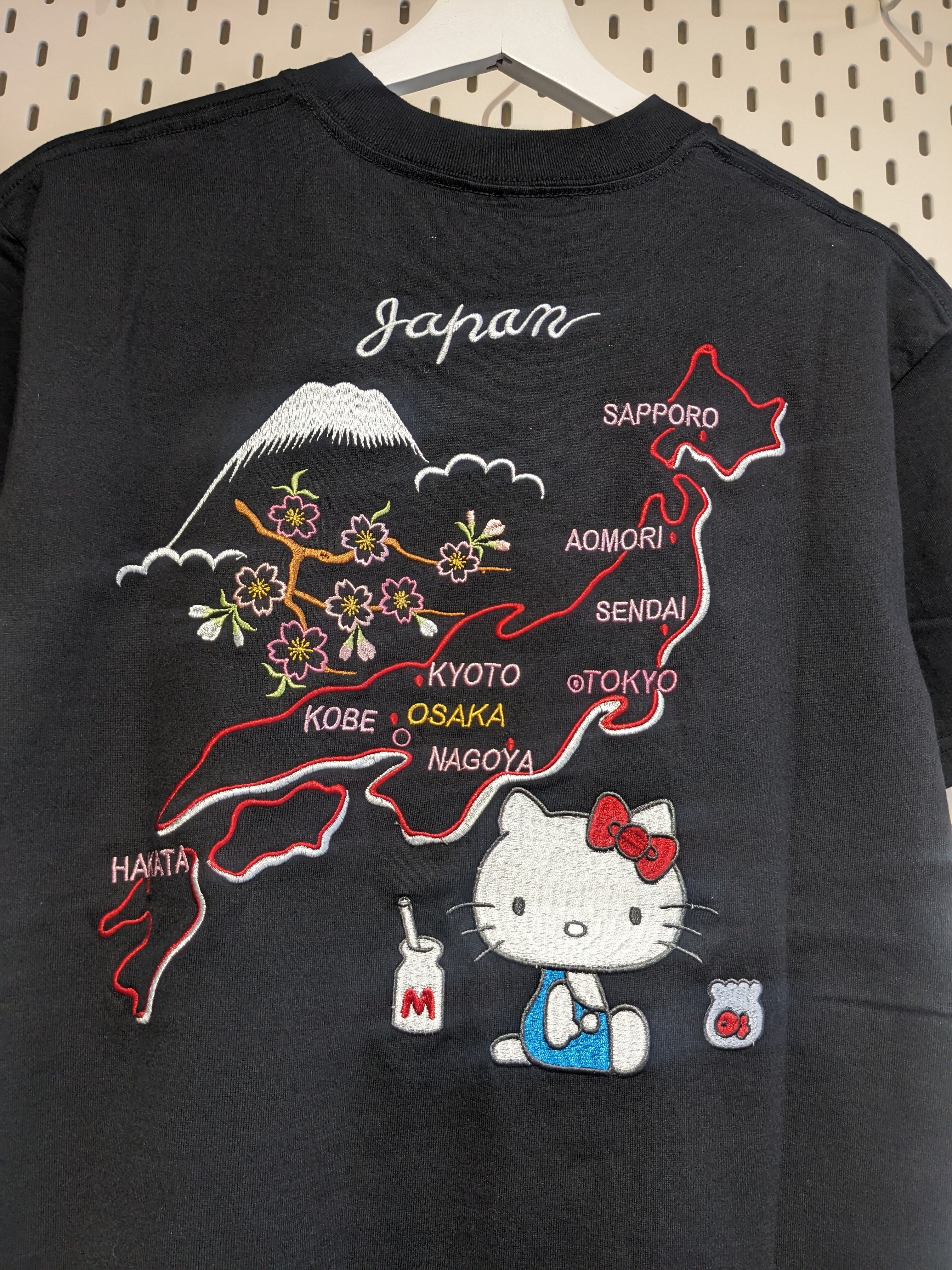 HKST-002 ハローキティと日本地図刺繍半袖Tシャツ ブラック M・L・XL・XXL