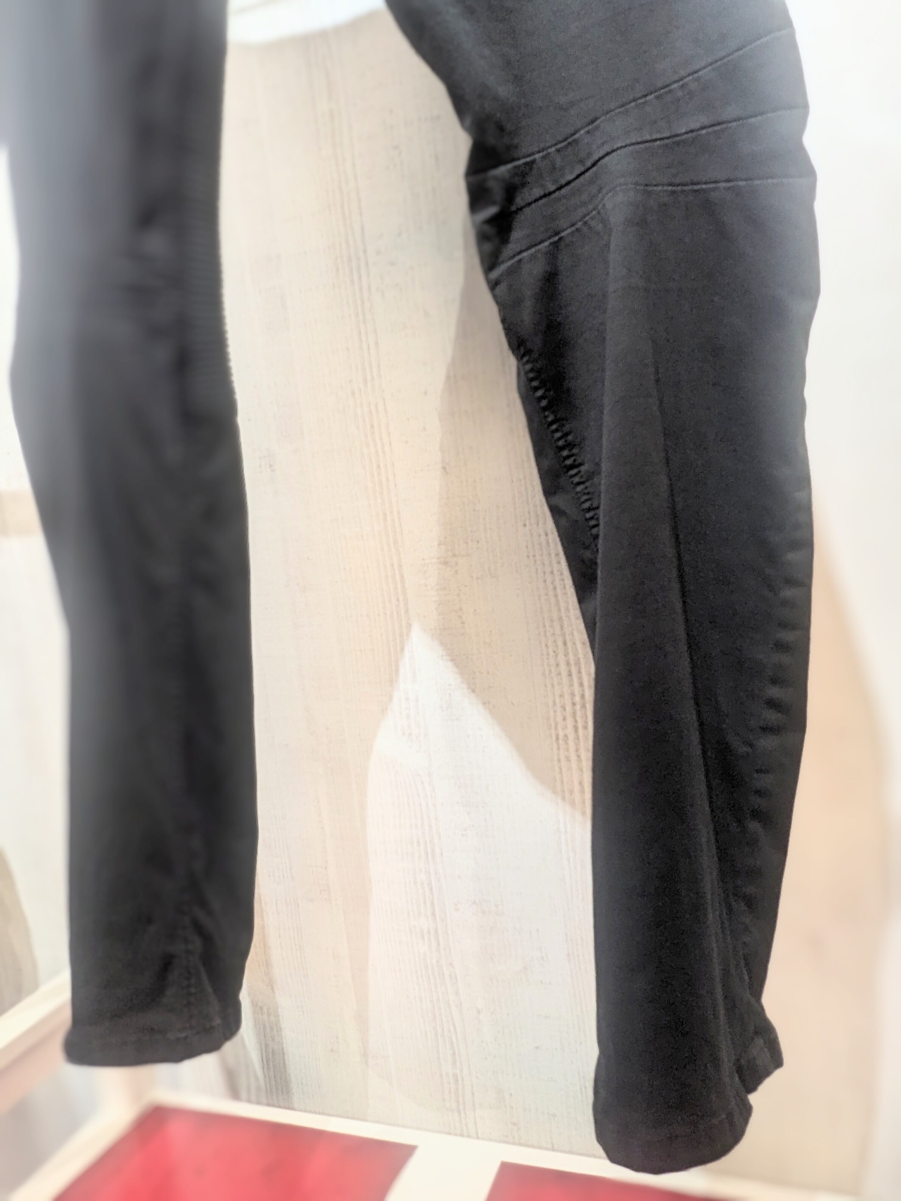 バックヨークと前身のポケットの部分に伸び縮みの襞上の補強素材にて補強されています。