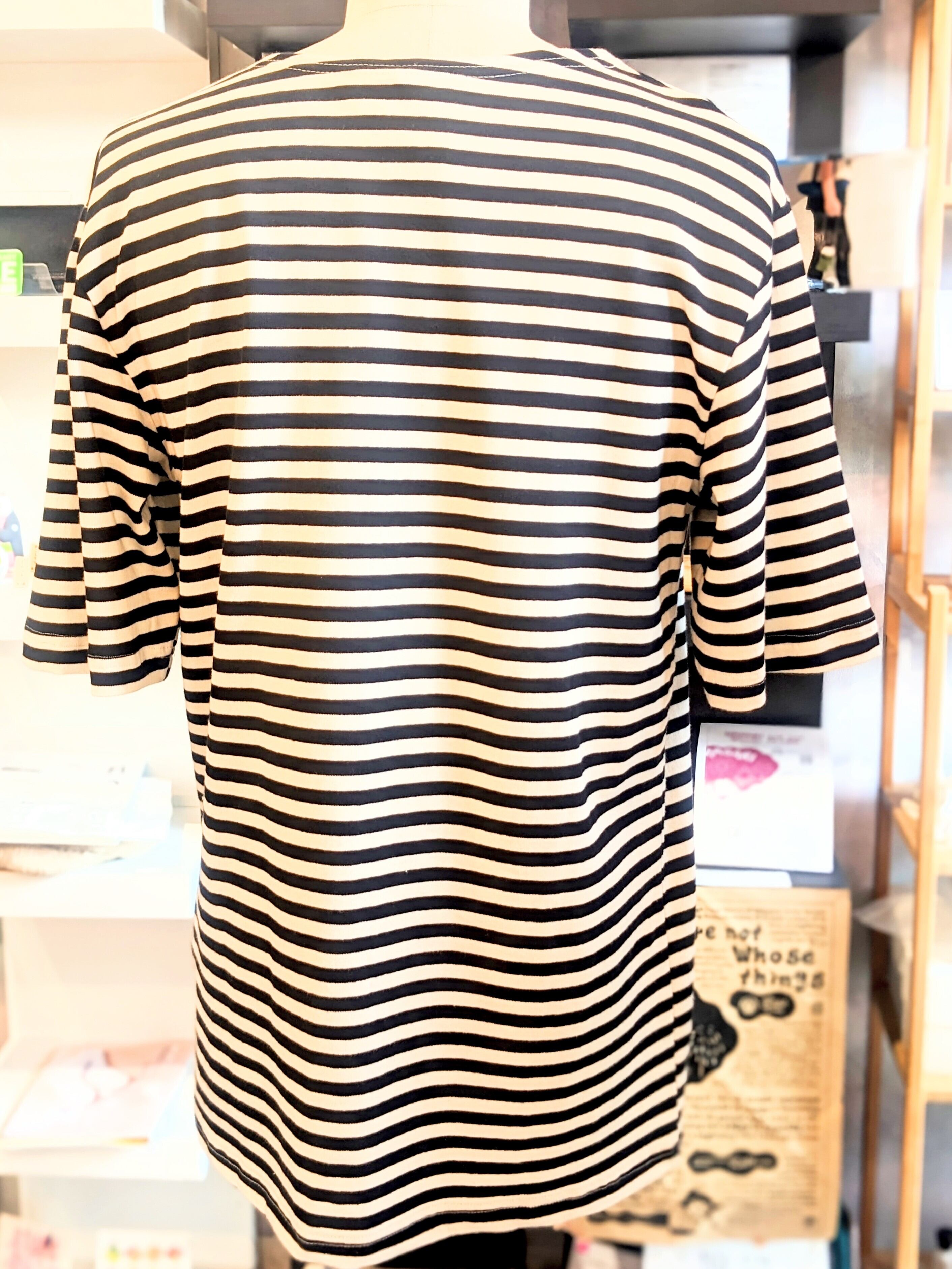 生地は肌触りが良く肉感もしっかりある中厚コットンで、一般的なTシャツとバスクシャツの中間のような手持ち感です。