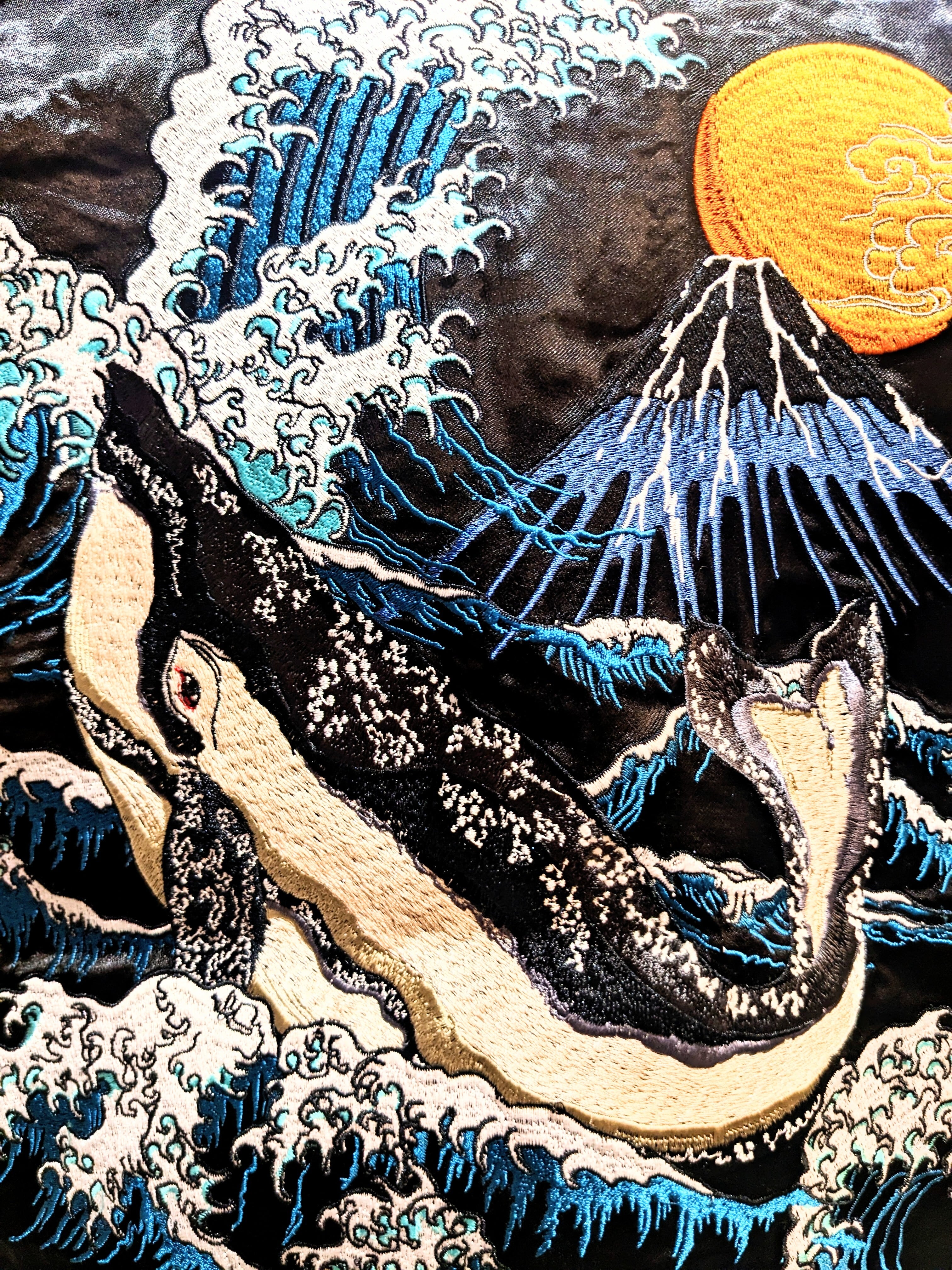 波に鯨 龍や虎など力強い刺繍が定番としてある和柄スカジャンのなか