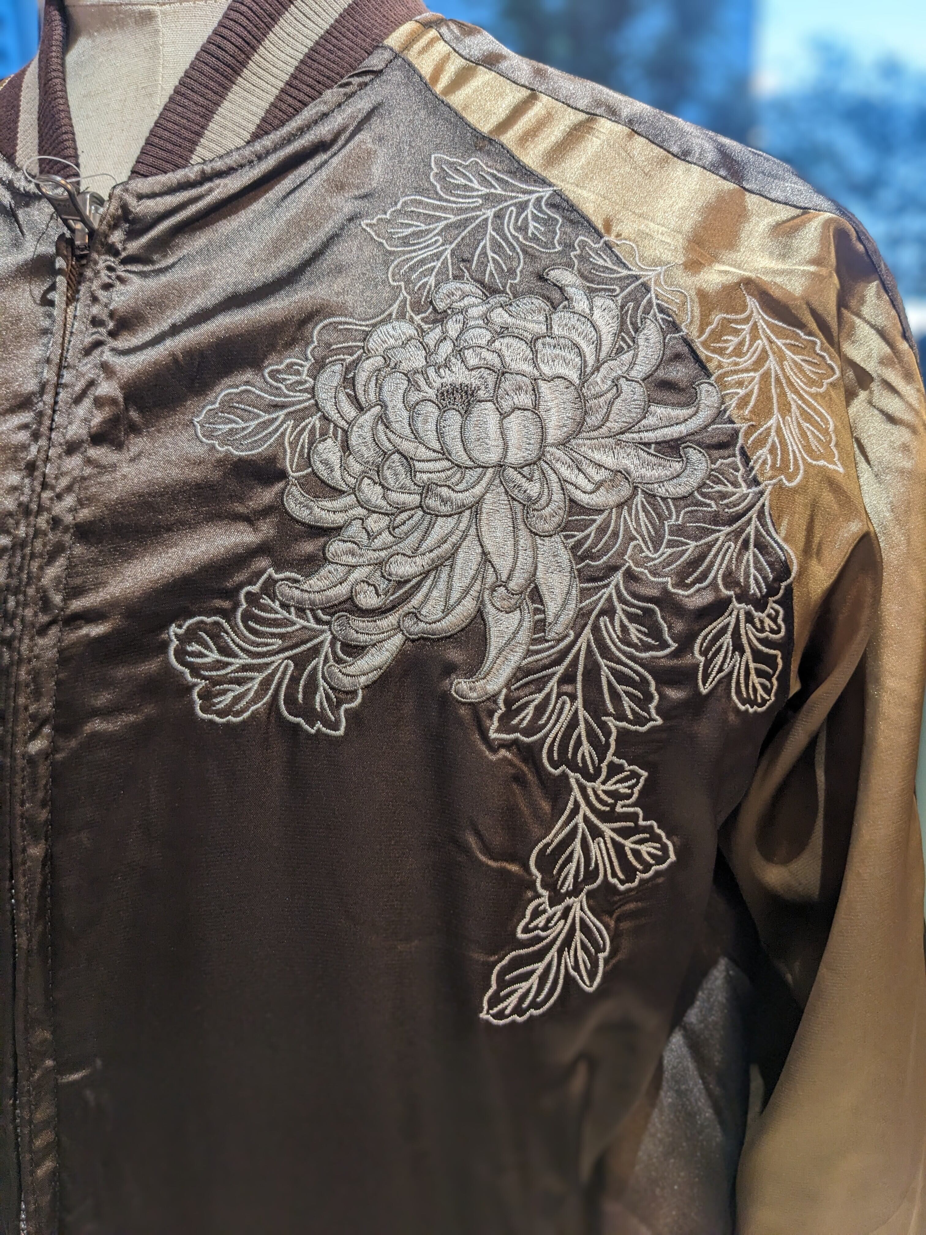 白孔雀 狐スカジャンの裏側は 菊の花とともに佇む白孔雀。