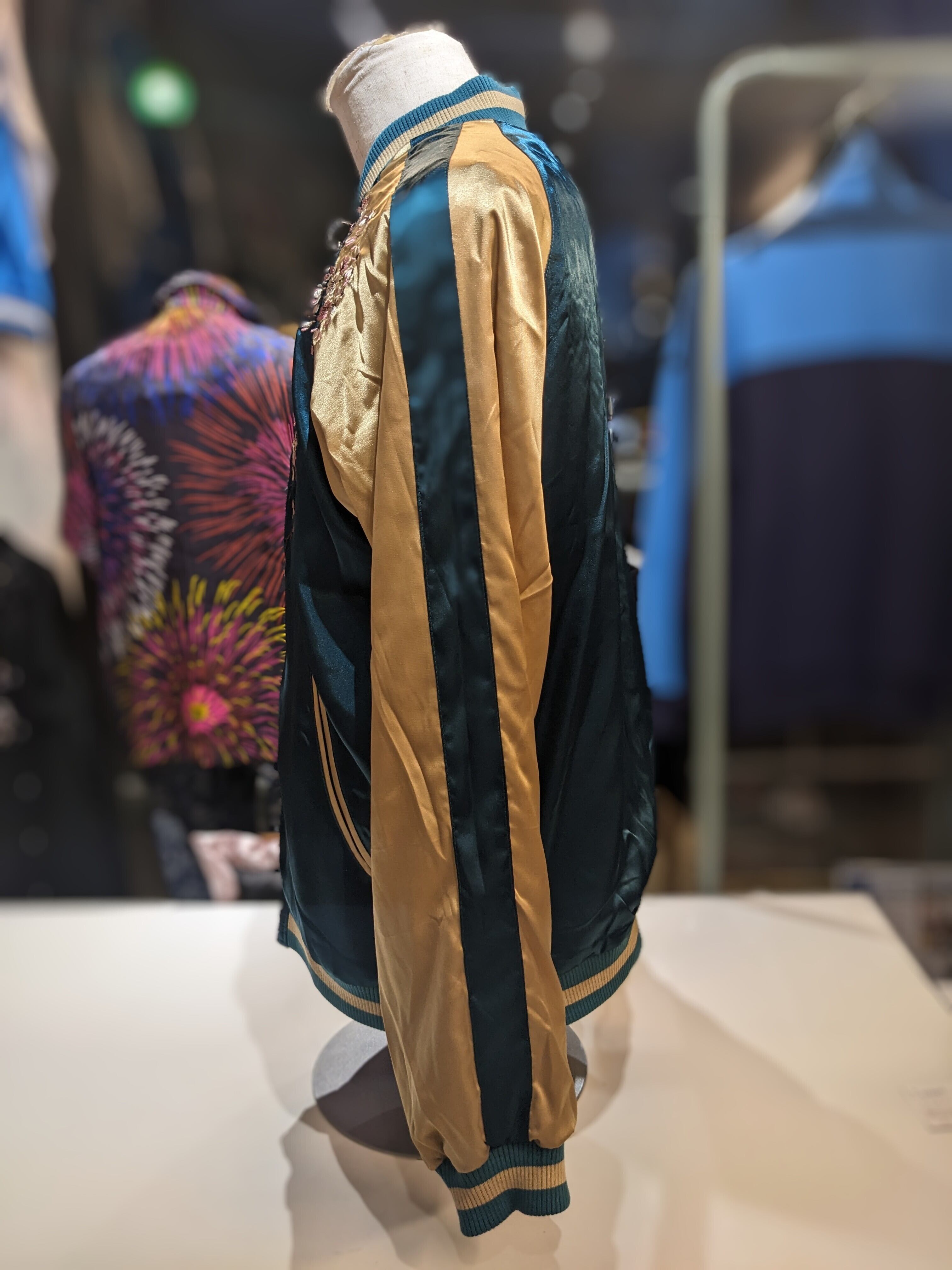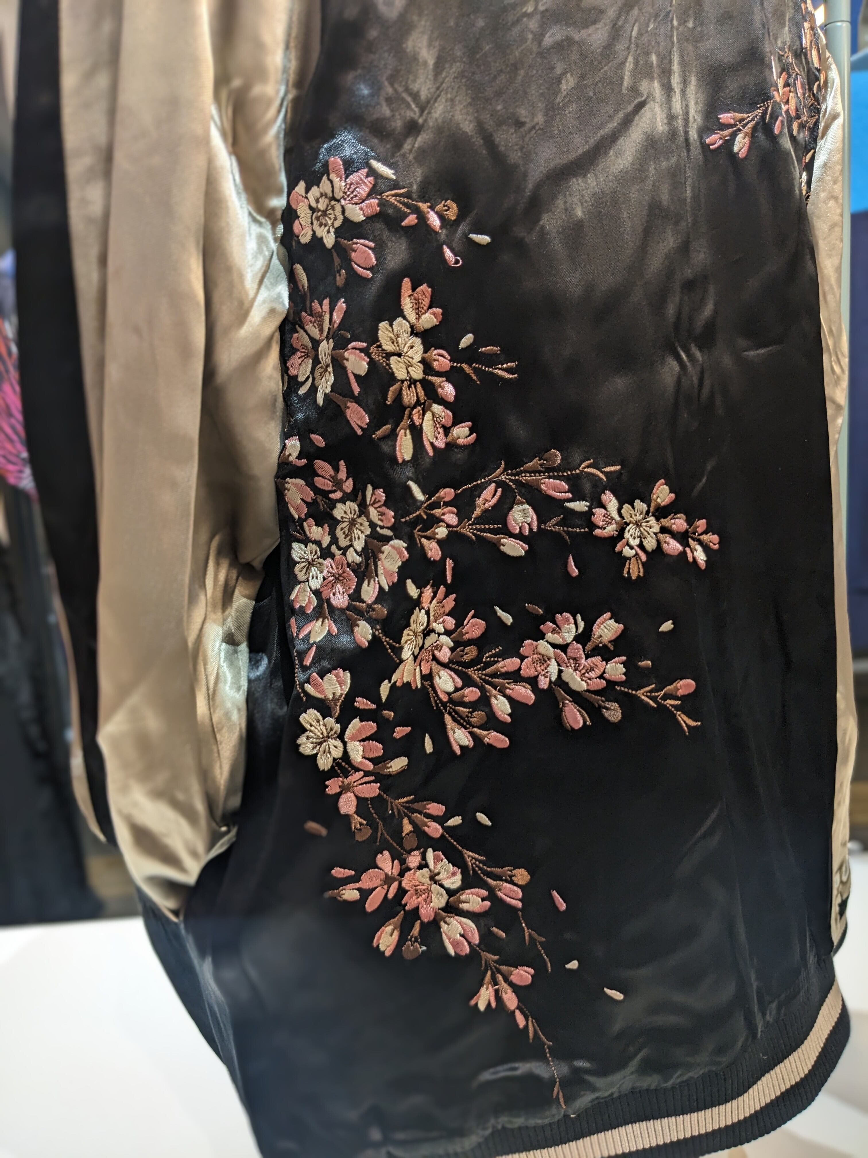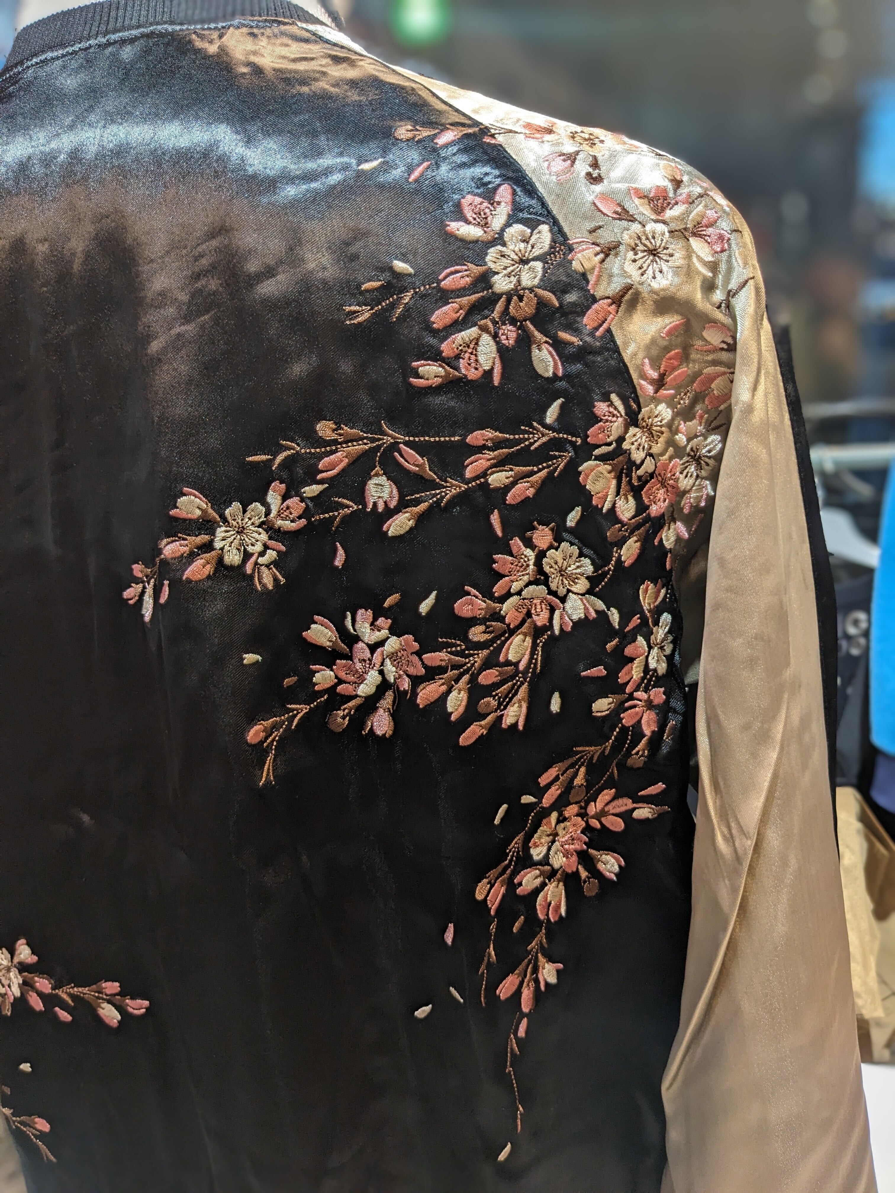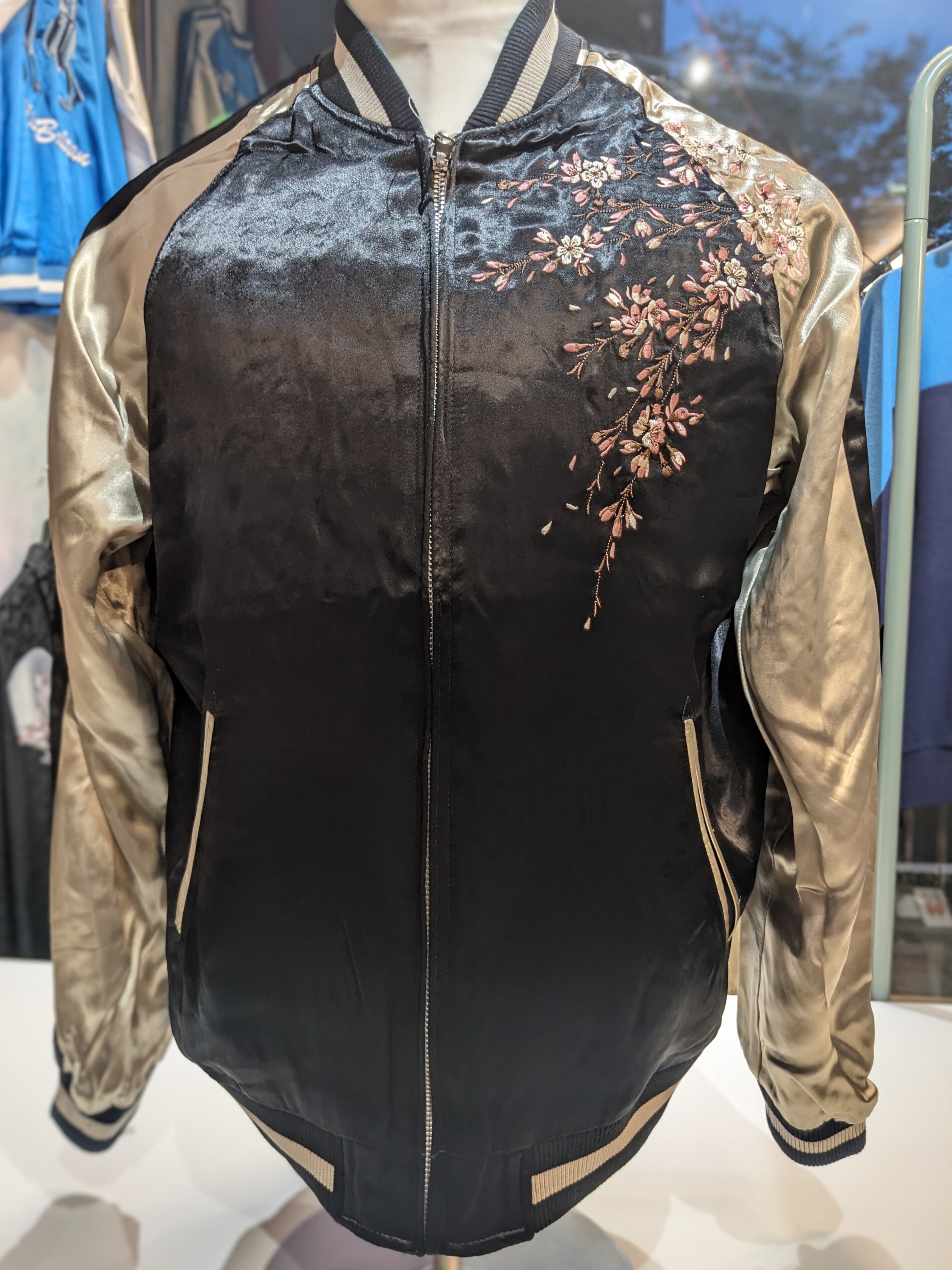 片側の胸と背中一面に桜のみを刺繍した、シンプルなデザインながらも華やかなスカジャン。