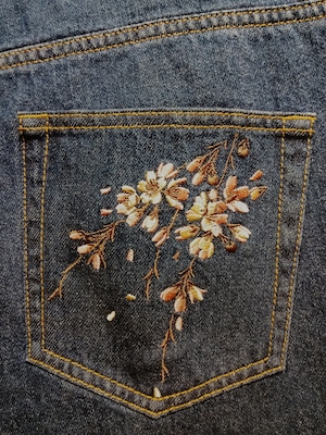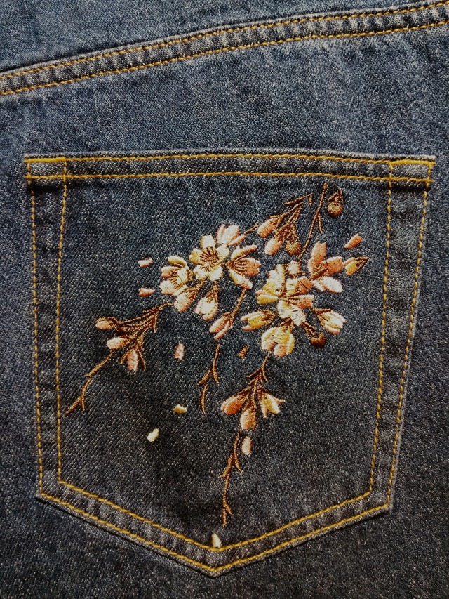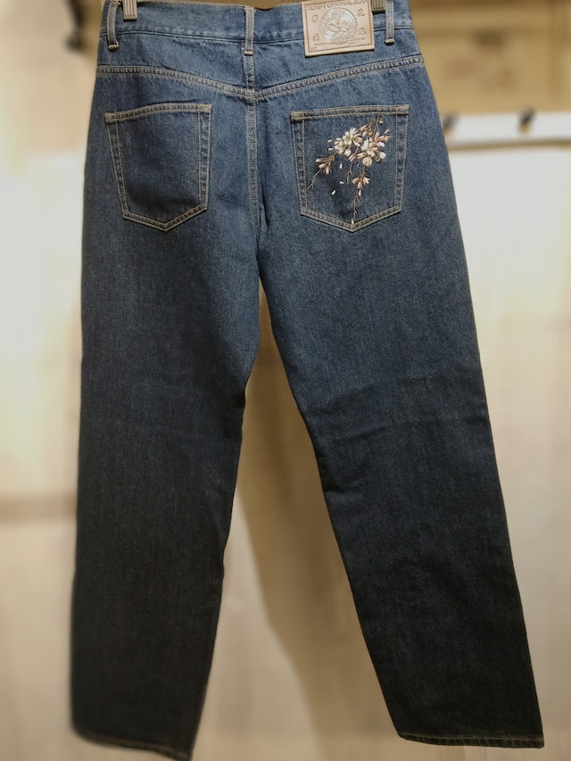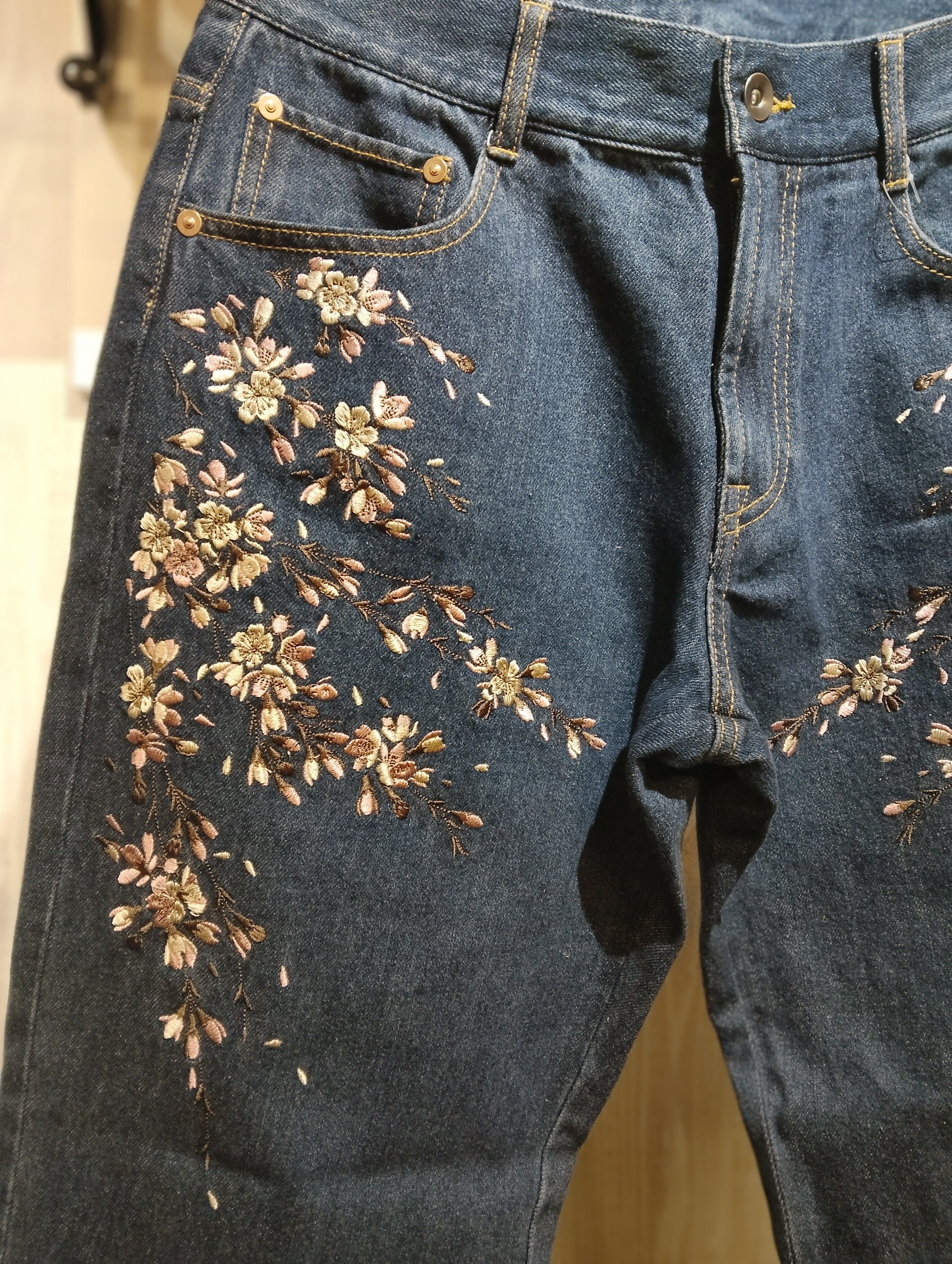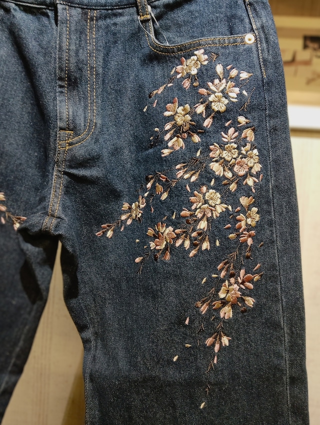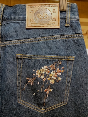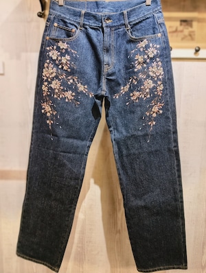 インディゴのデニムに温かみのある桜を刺繍したパンツ。
