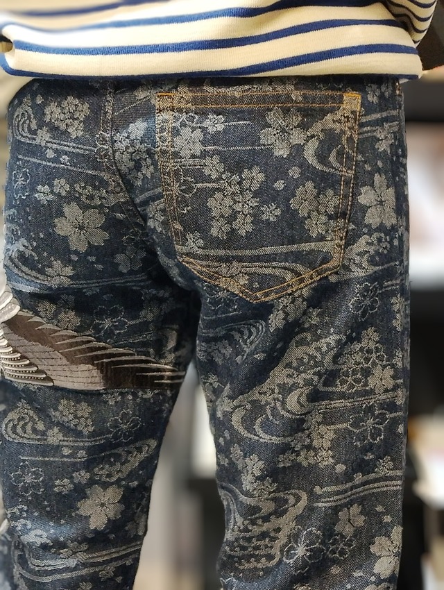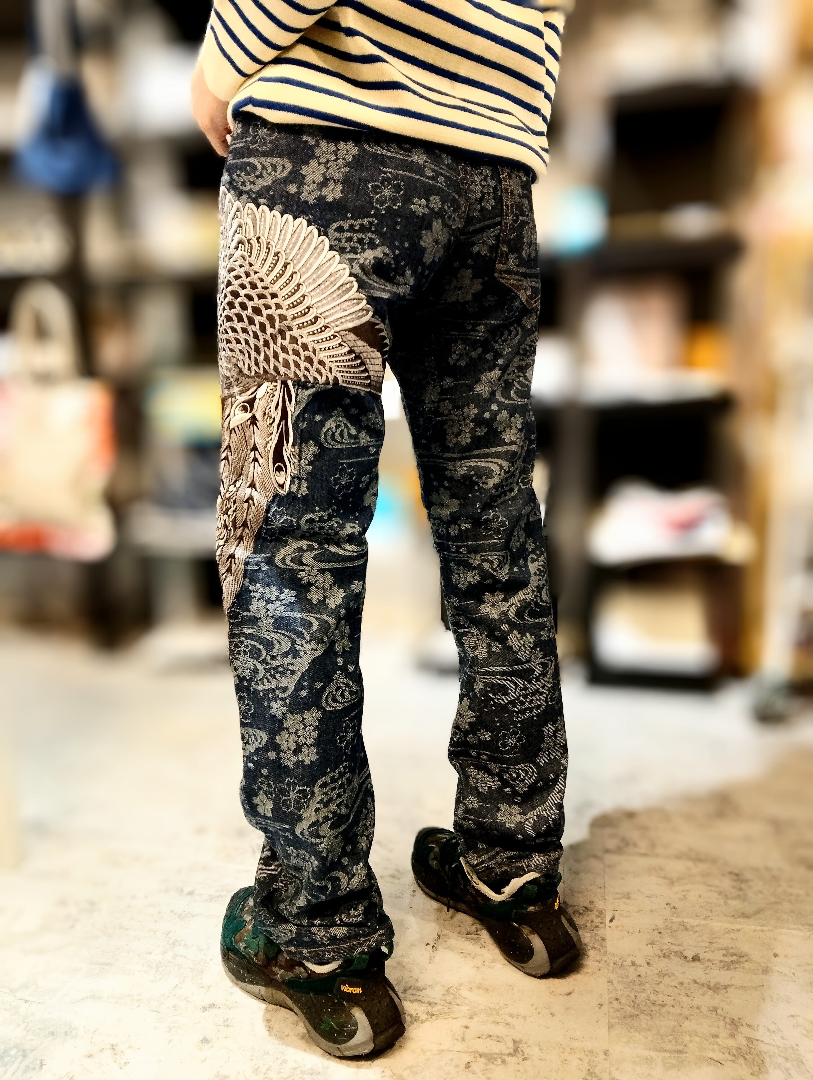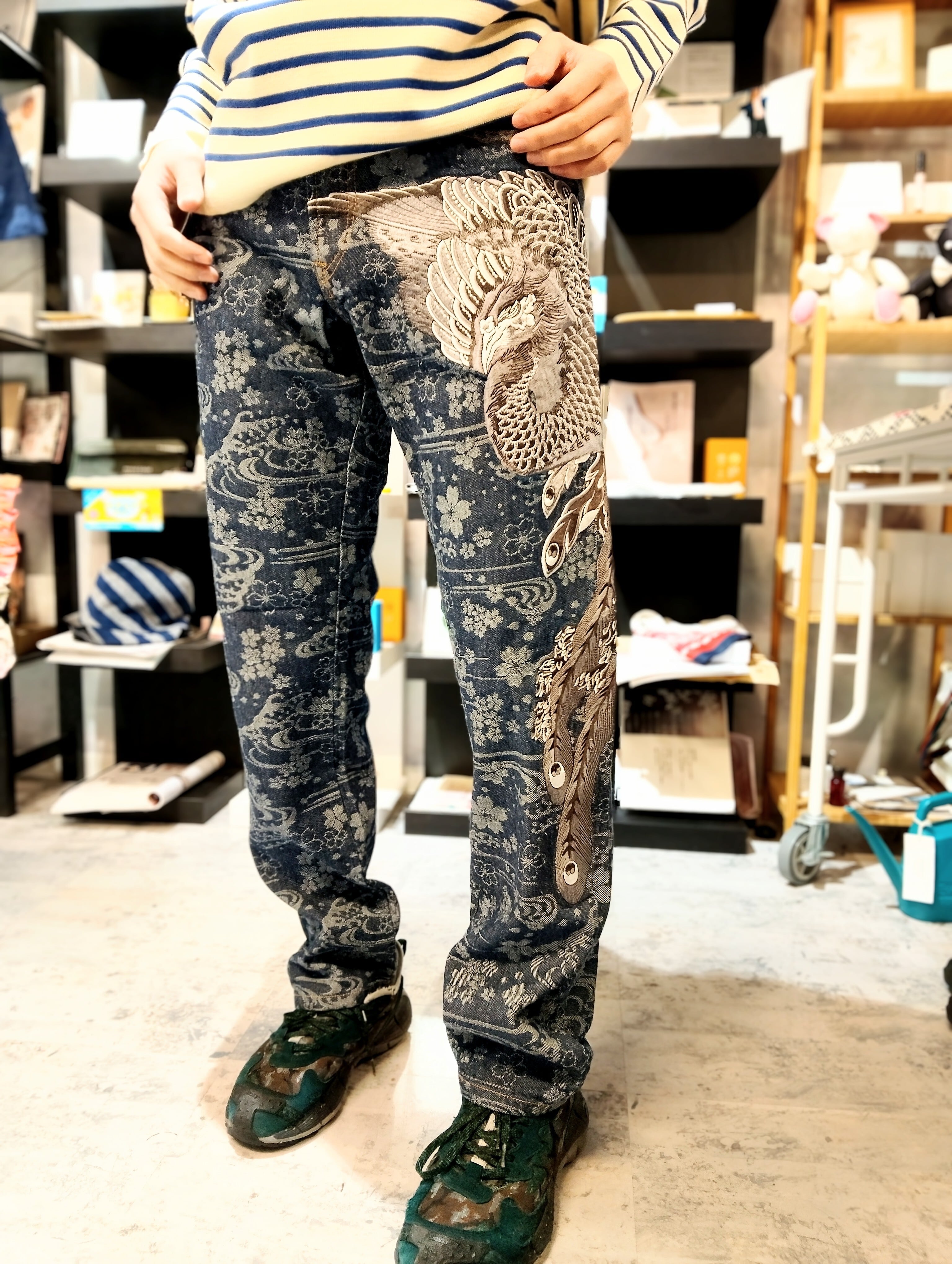 鳳凰柄刺繍オリジナルジャガードデニム パンツ インディゴ 花旅楽団-SP-550