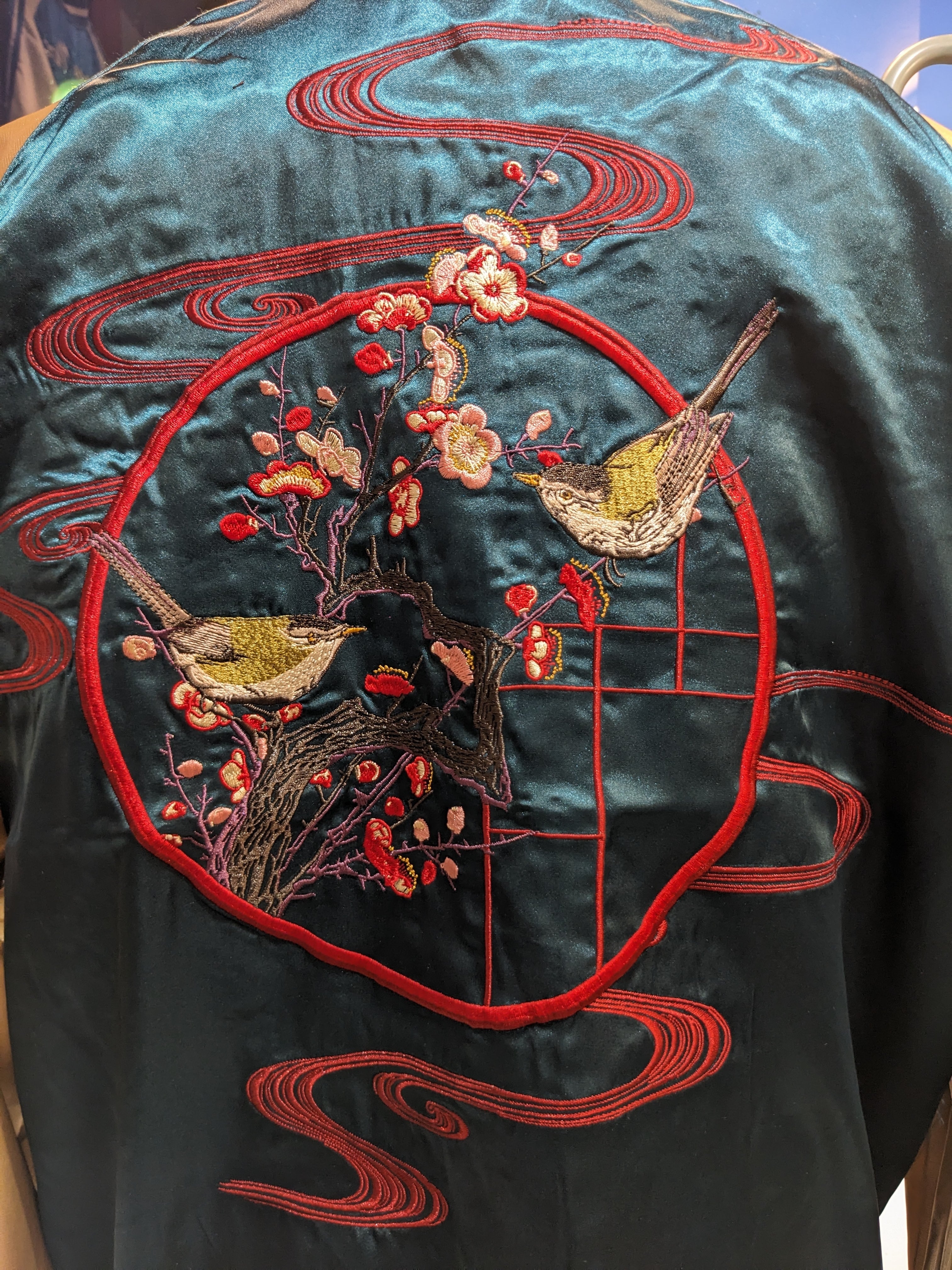 梅とウグイス 花咲く梅 その枝にとまるウグイスのスカジャン。ボディには表と同じターコイズブルーを使用。表目では水面たった青が 裏面では空に見えるのだから面白い。