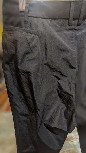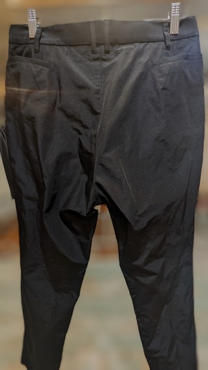 タックを入れることで、ゆったりとした腰周りと渡りを作り、テーパードに仕上げた。