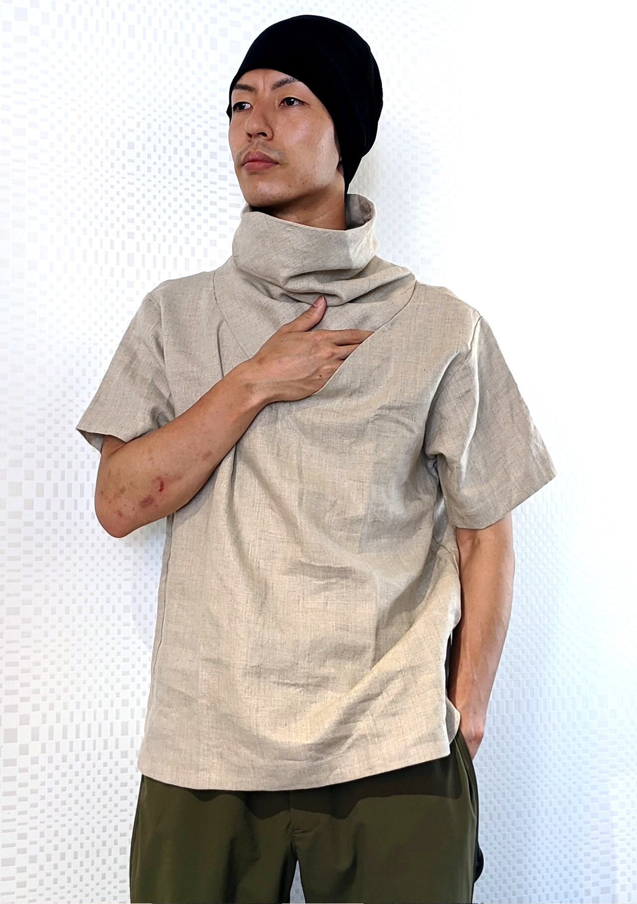 SS-OB01 HIGH TECH のリネンバージョン。 左の襟切り替え部分にスラッシュポケット。 襟高のスタンドカラーで鼻口元を覆う事が出来る。 スタンドカラー上部分にスピンドルがついており、 鼻口元に固定可能。襟元の美しいドレープとリネン素材の相性が良く、それでいて機能的。