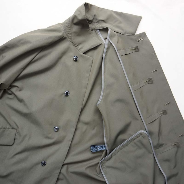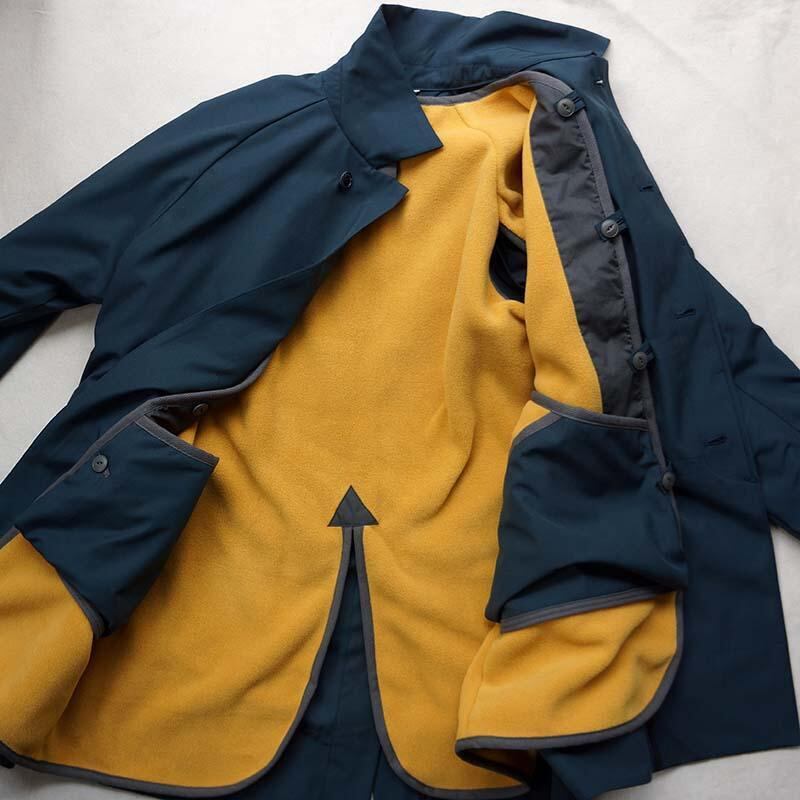 撥水素材のAラインコートにPOLARTECフリースのライナーを付けたボリュームのあるステンカラーコート。