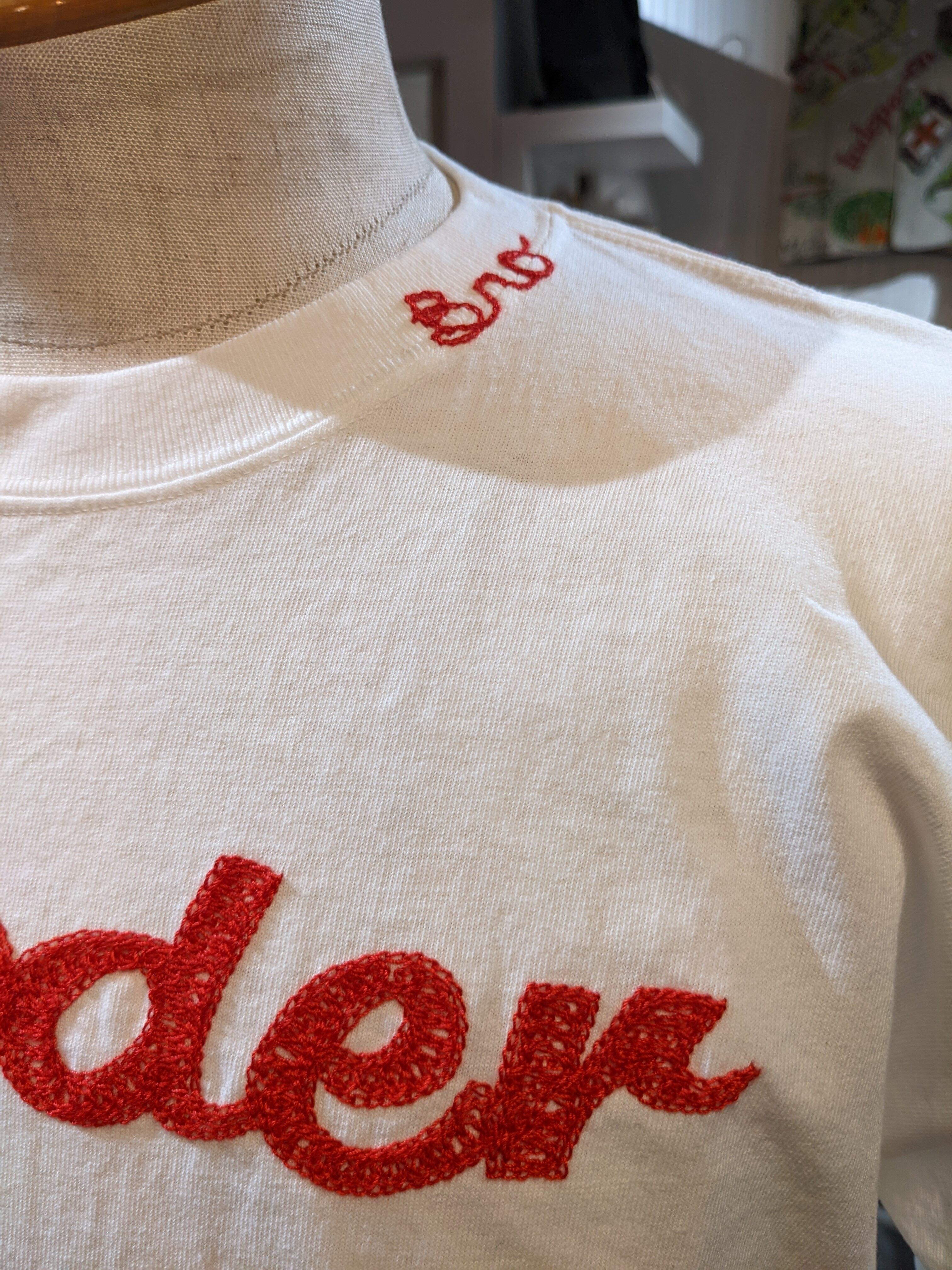下の糸を、かぎ針で引っかけチェーンステッチで刺繍を施してます。