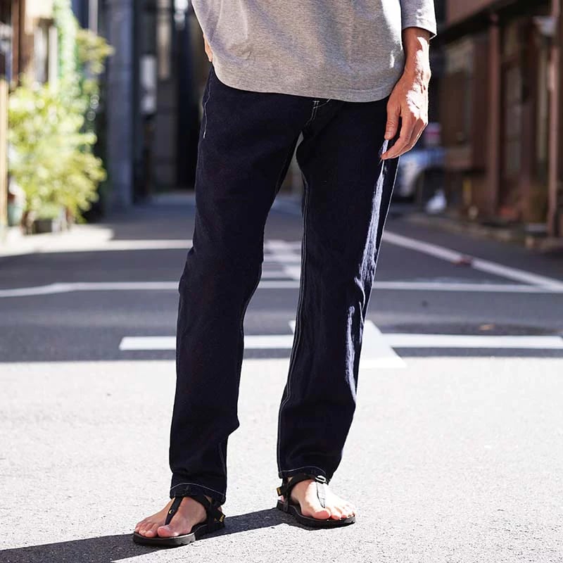 脇接ぎのないパターンによりルーズ感を出しつつもテーパードでスッキリとした印象。
