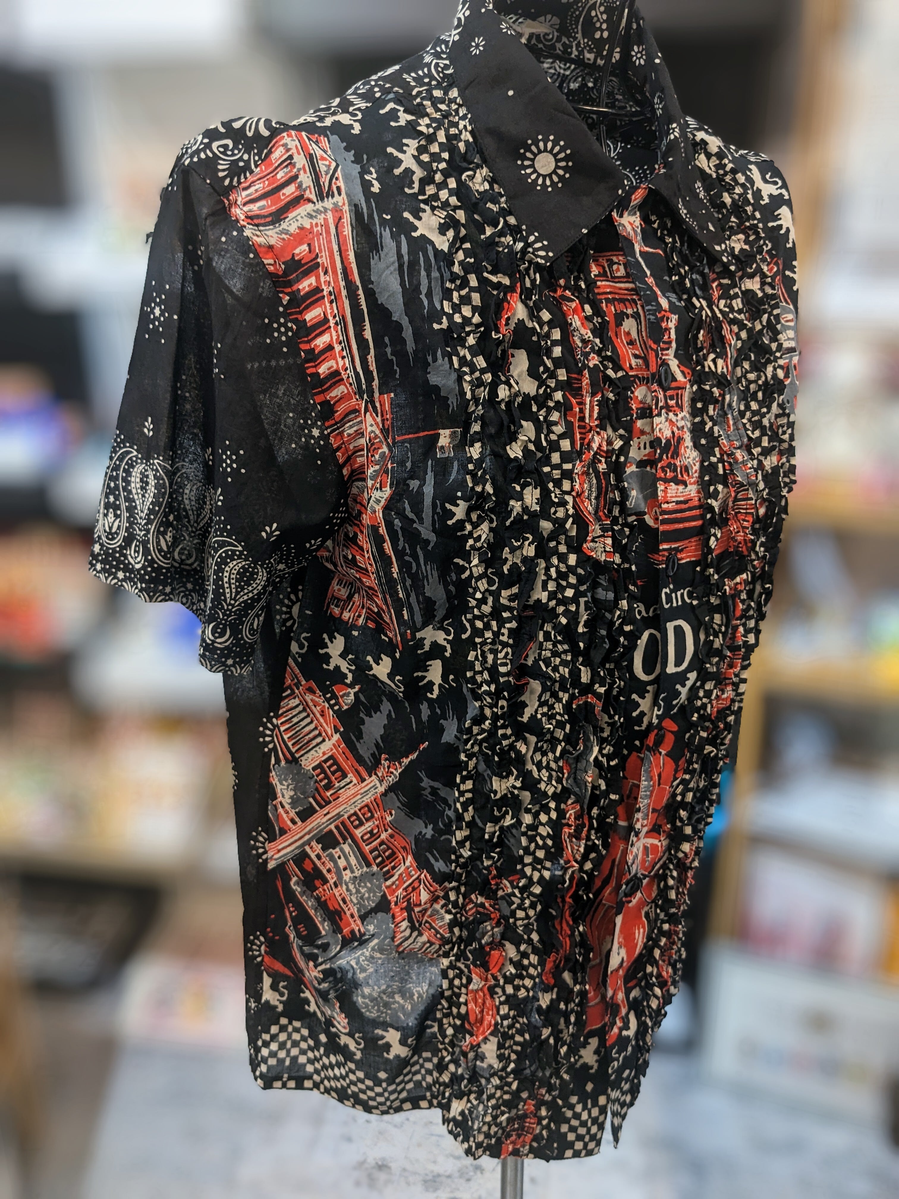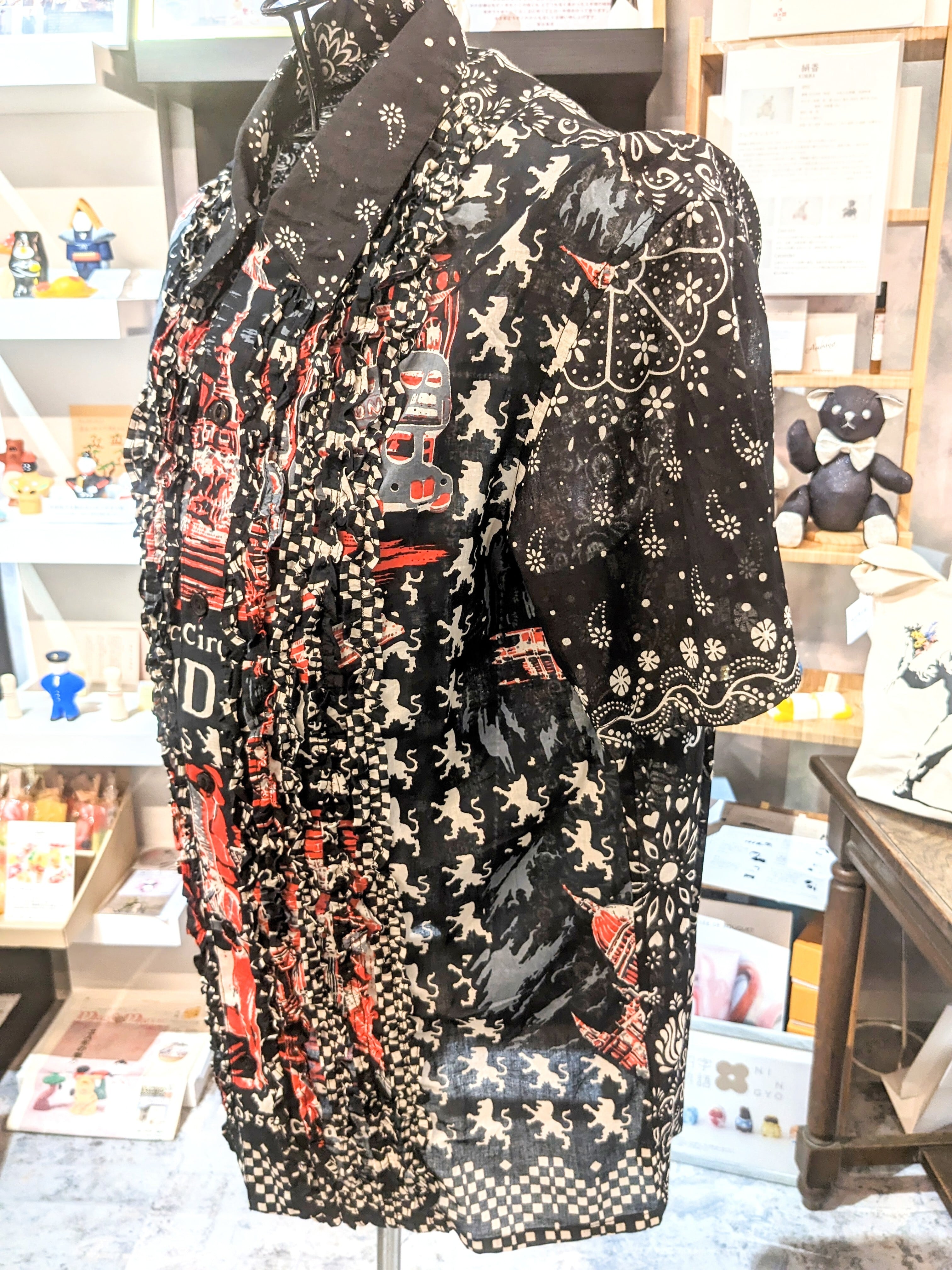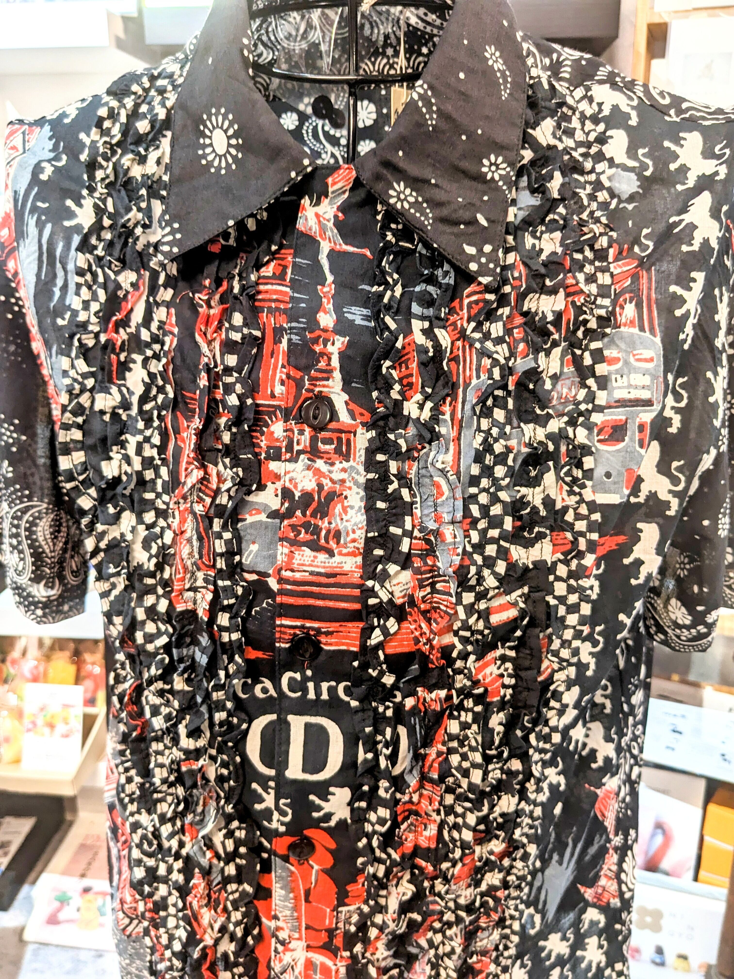 ロンドンとバッチワークバンダナ 1478とのクレージーパターンのフリルオープンシャツです。