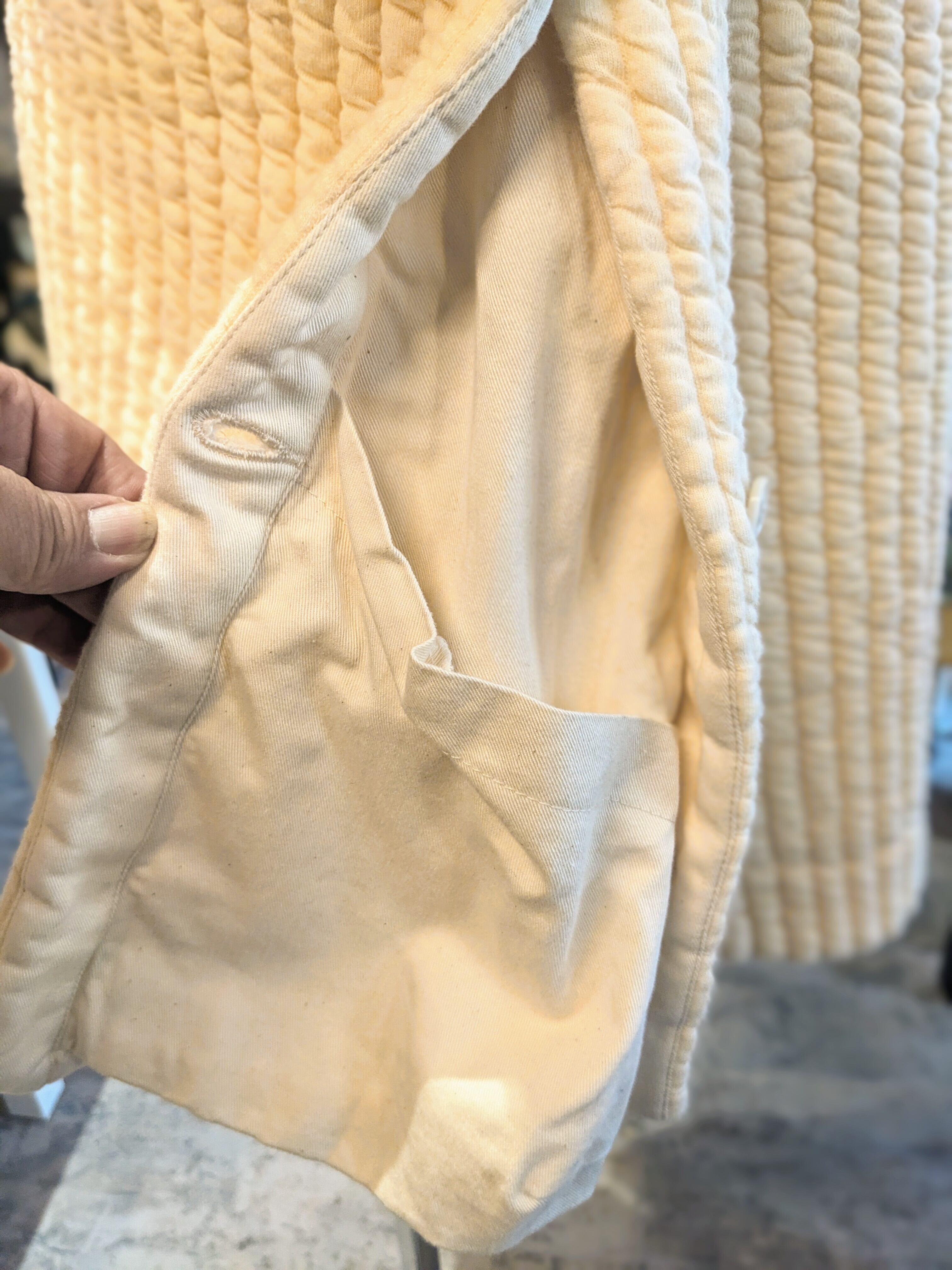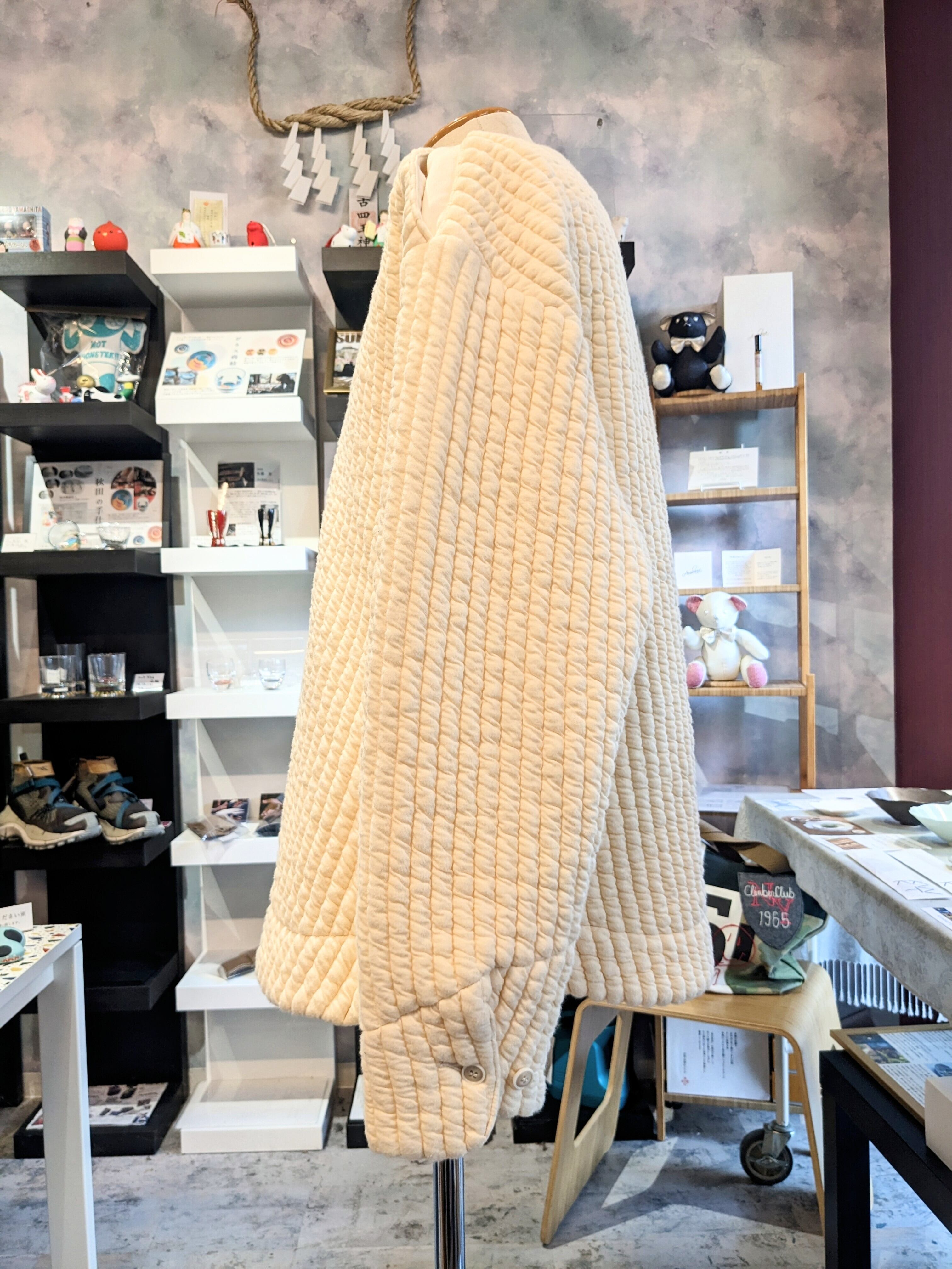 キルトなのに十分なストレッチが効き、アイボリー、脇のボタンを外せばポケットが出てきて、しっかりとギミックも搭載されている。