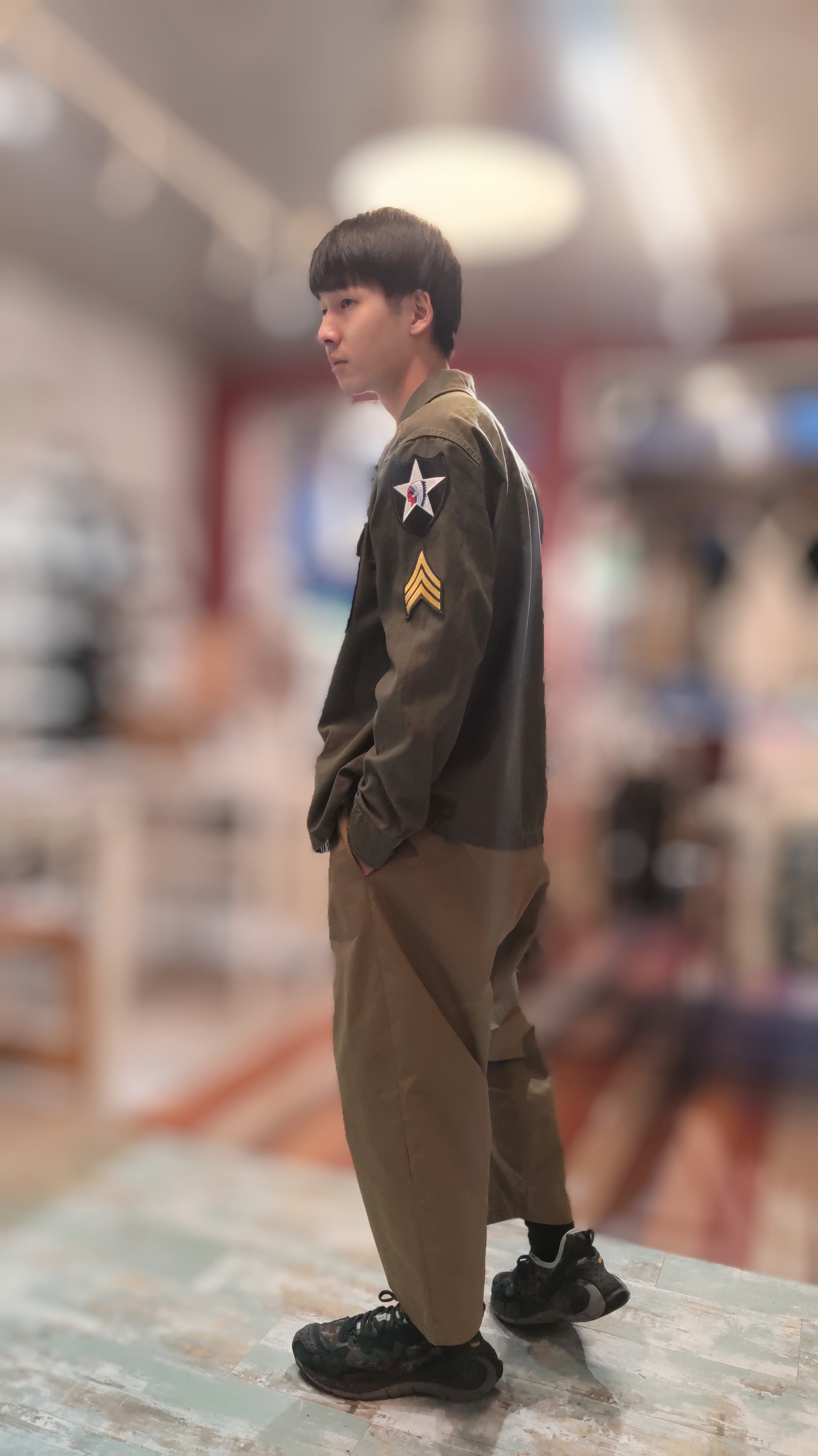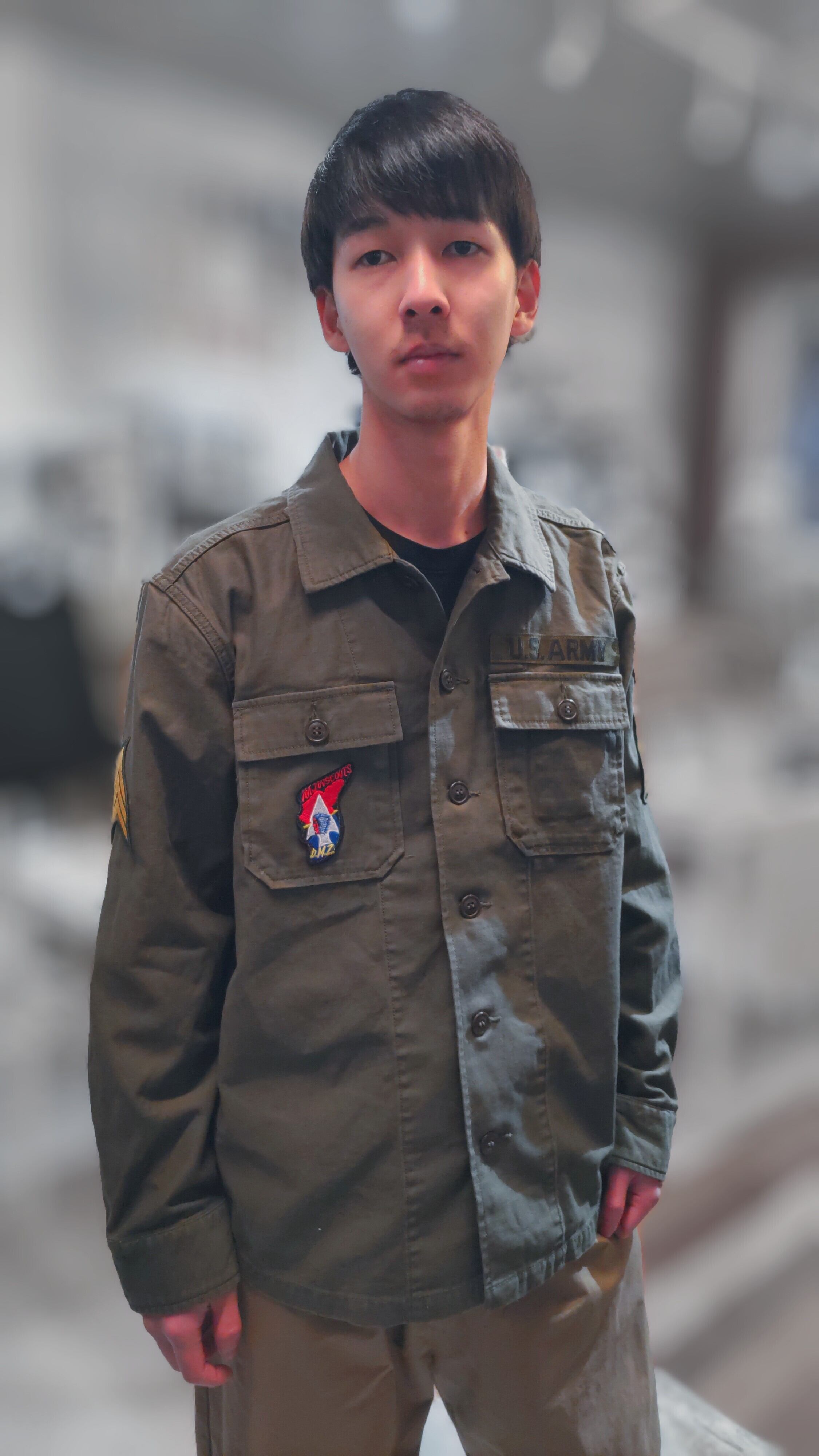 ファティーグシャツに、胸元には Imjin Scoutsと レター US ARMY、左腕にはアメリカ軍 第2歩兵師団の部隊章、両腕に軍曹の階級章が縫い付けられています。