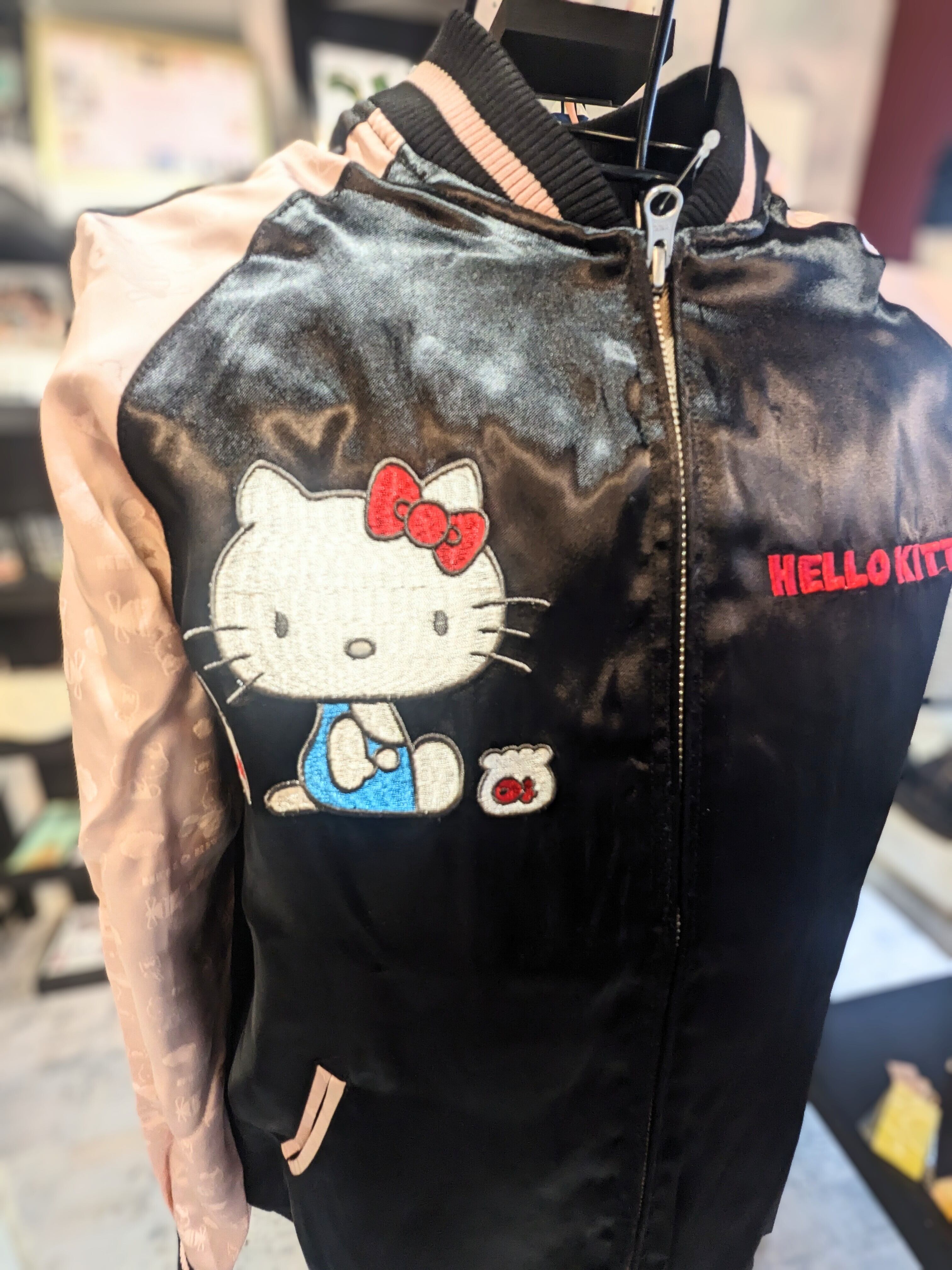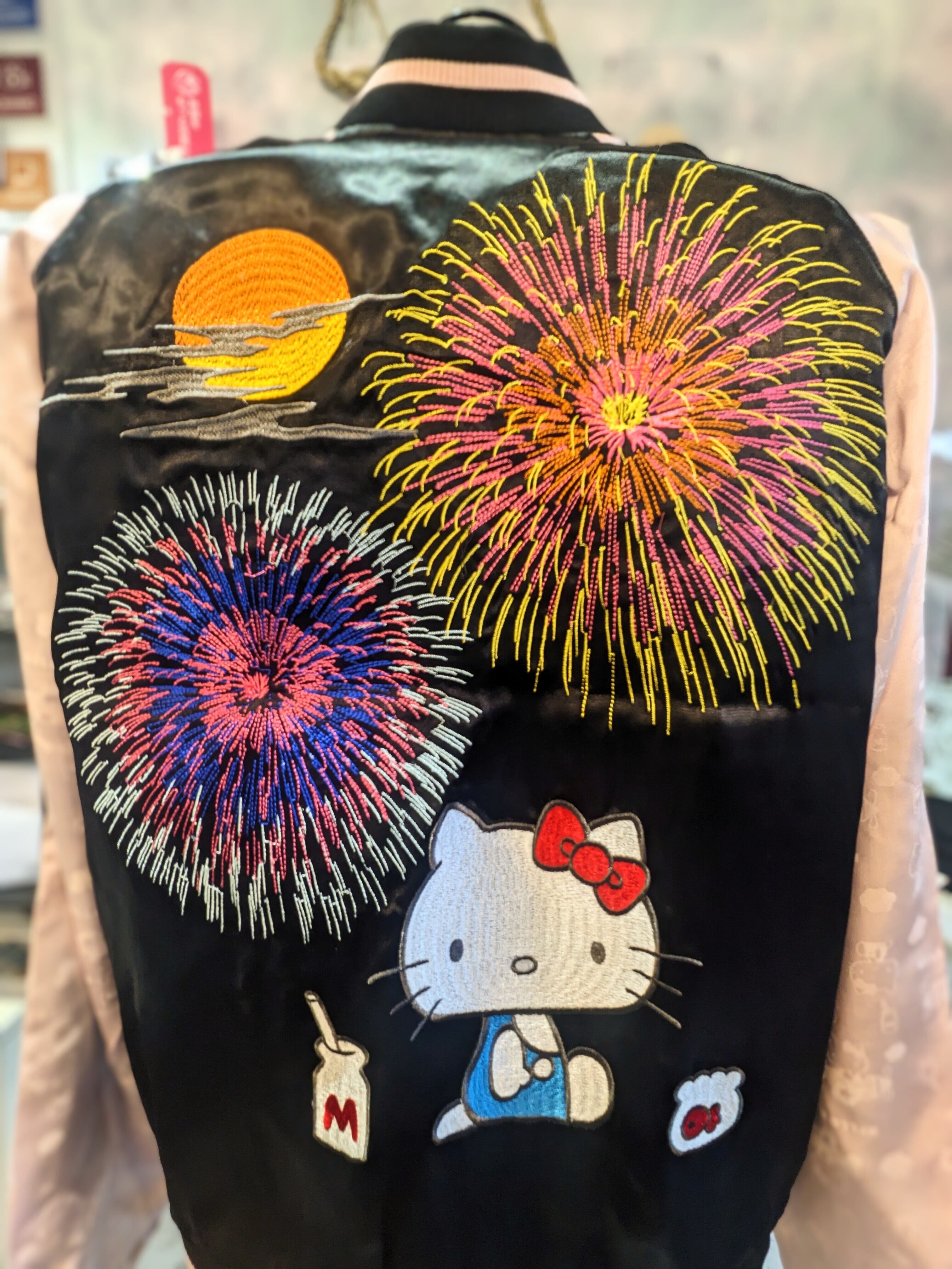 HKSJ-511 ハローキティと花火 刺繍 ジャガード袖 スカジャン ブラック×ピンク