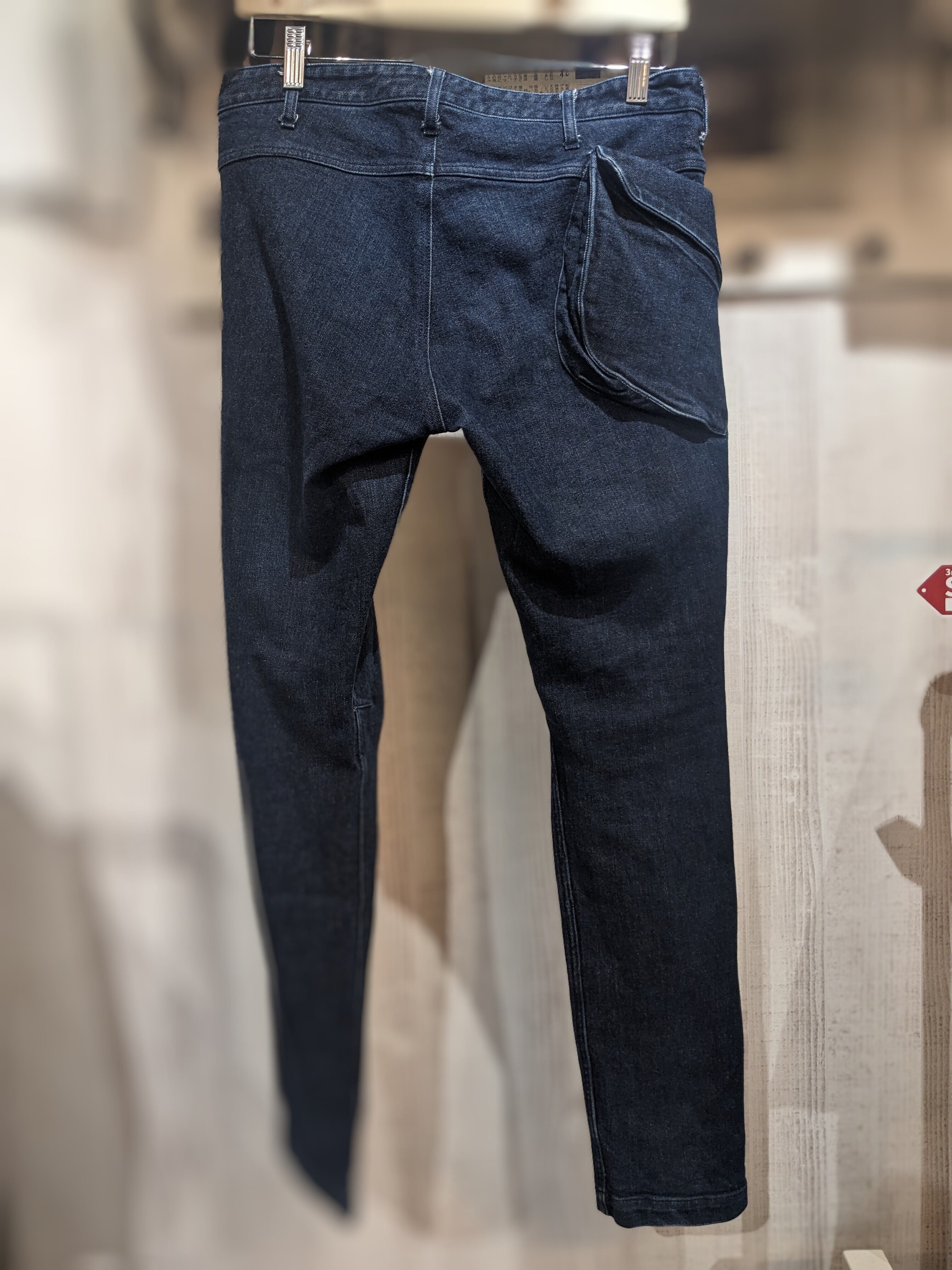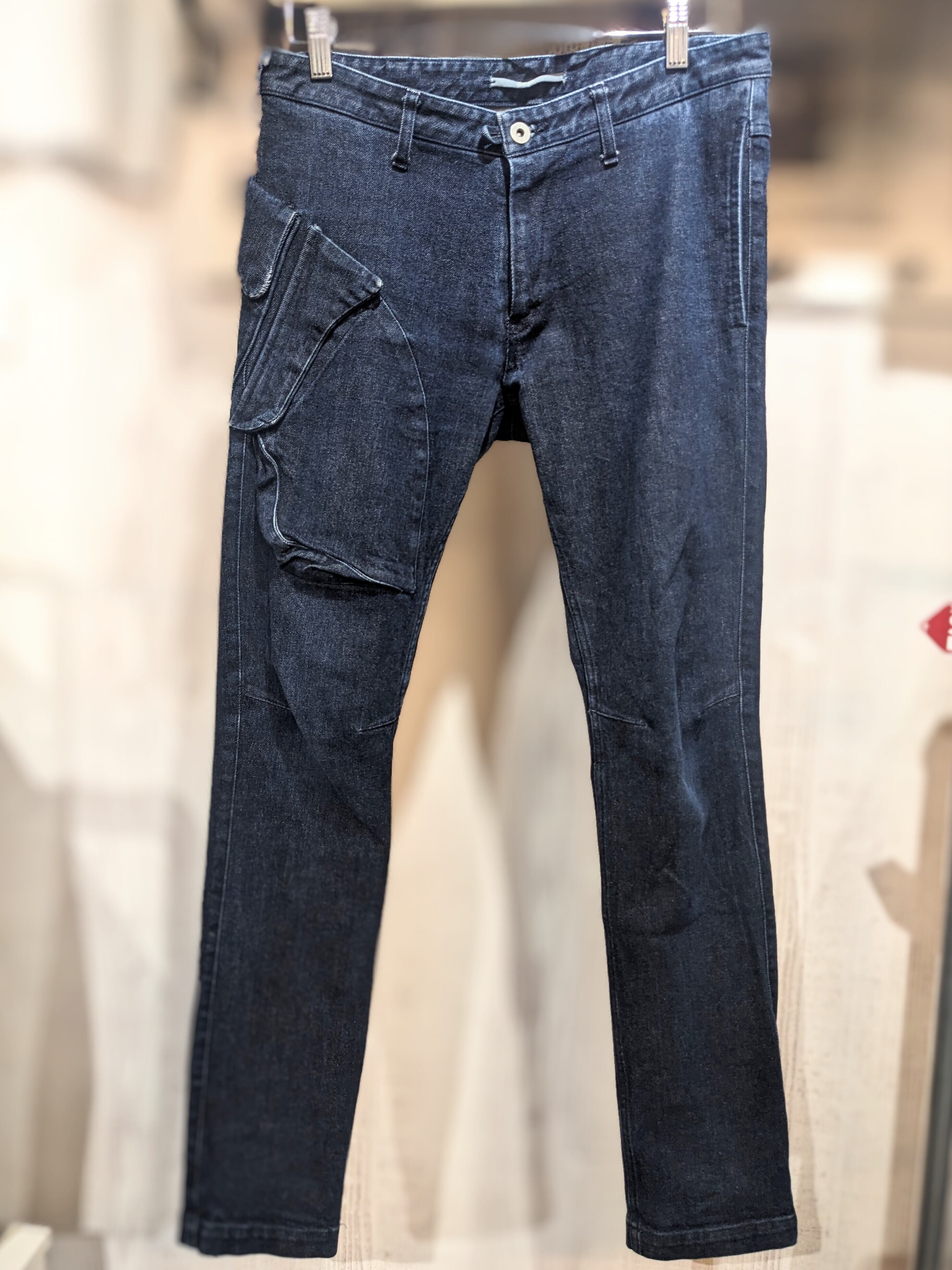 右側の腰のところにカーゴPのポケットが2つ付いたストレッチスキニーデニムパンツ。