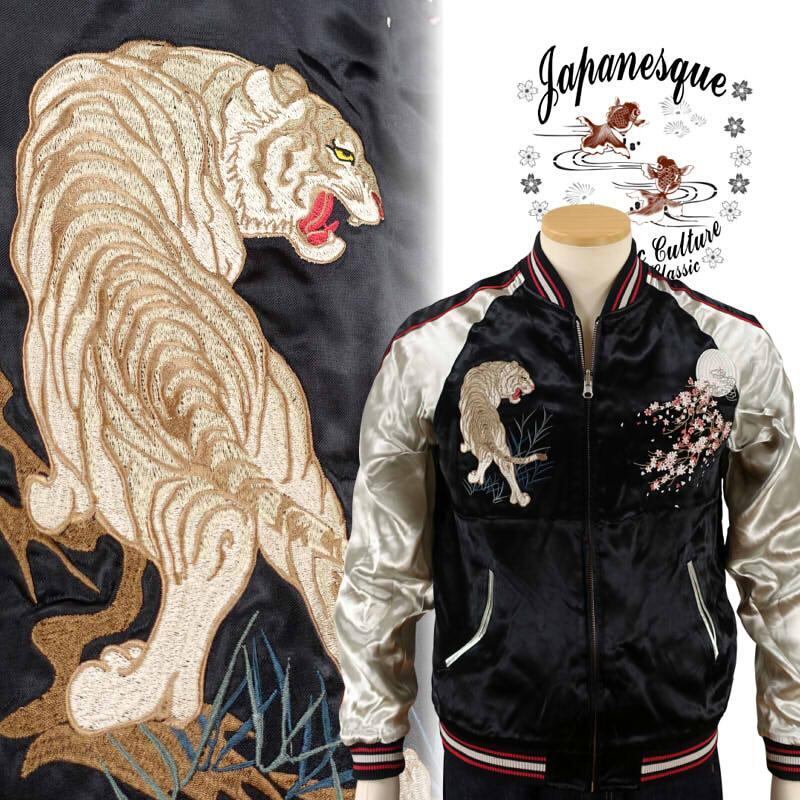 JAPANESQUE SUKAJAN JSKJ-511 月に白虎 和柄 BLACK M/L/XL/XXL 桜の先に浮かぶ満月を鋭い眼光で睨む白虎