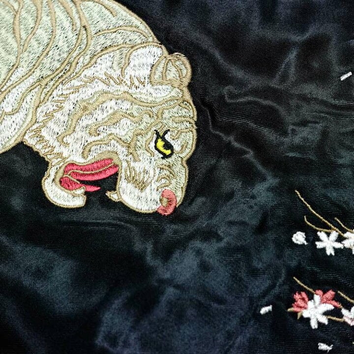 舞い散る桜の先に浮かぶ満月を鋭い眼光で睨む白虎が刺繍された一枚。